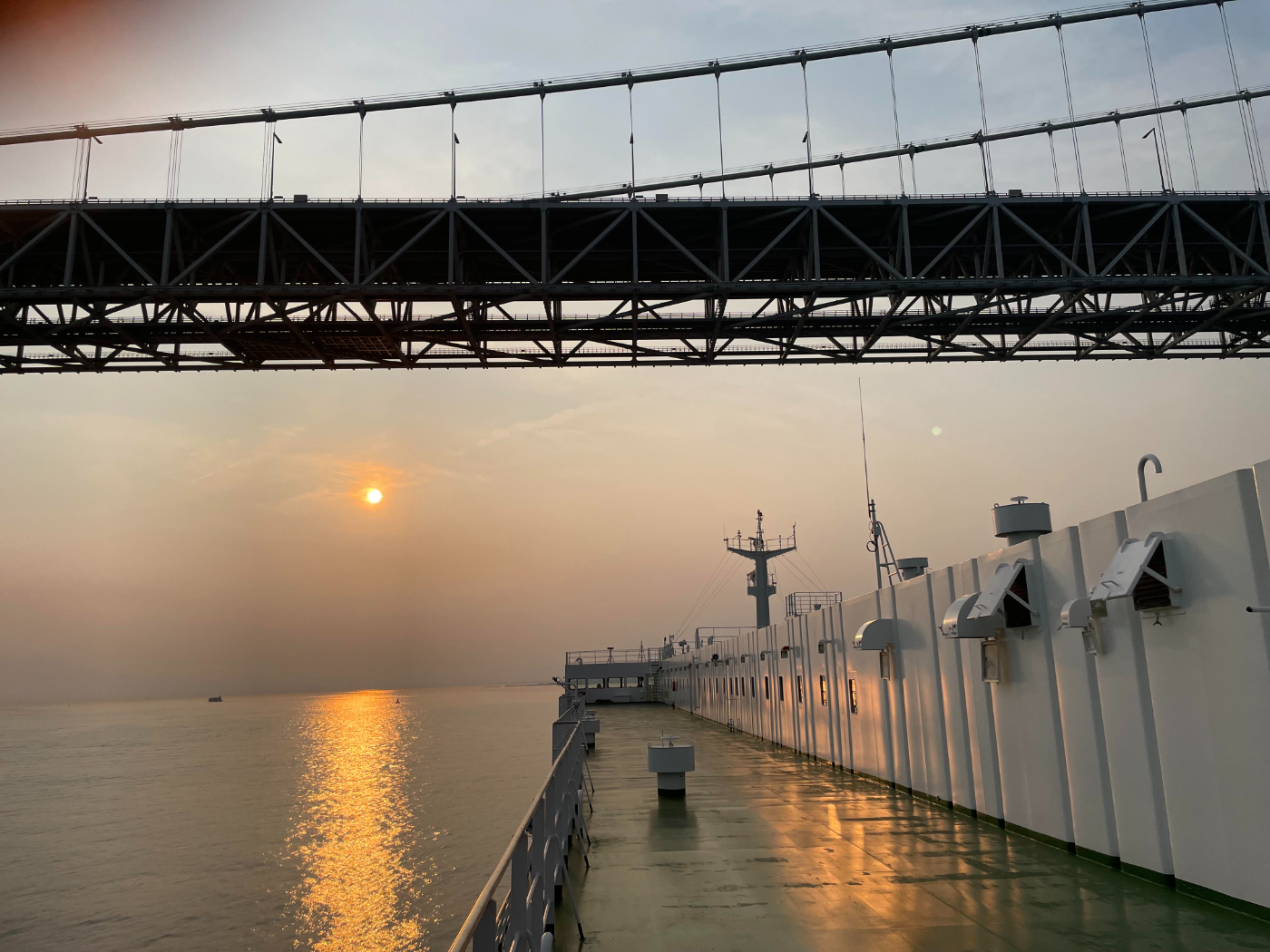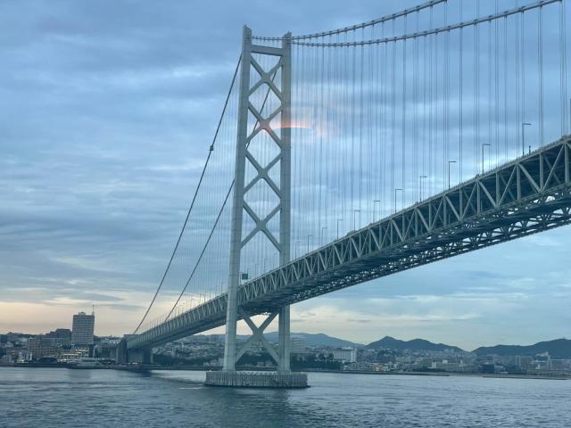 フェリーが 明石海峡大橋の下を通過するとき
